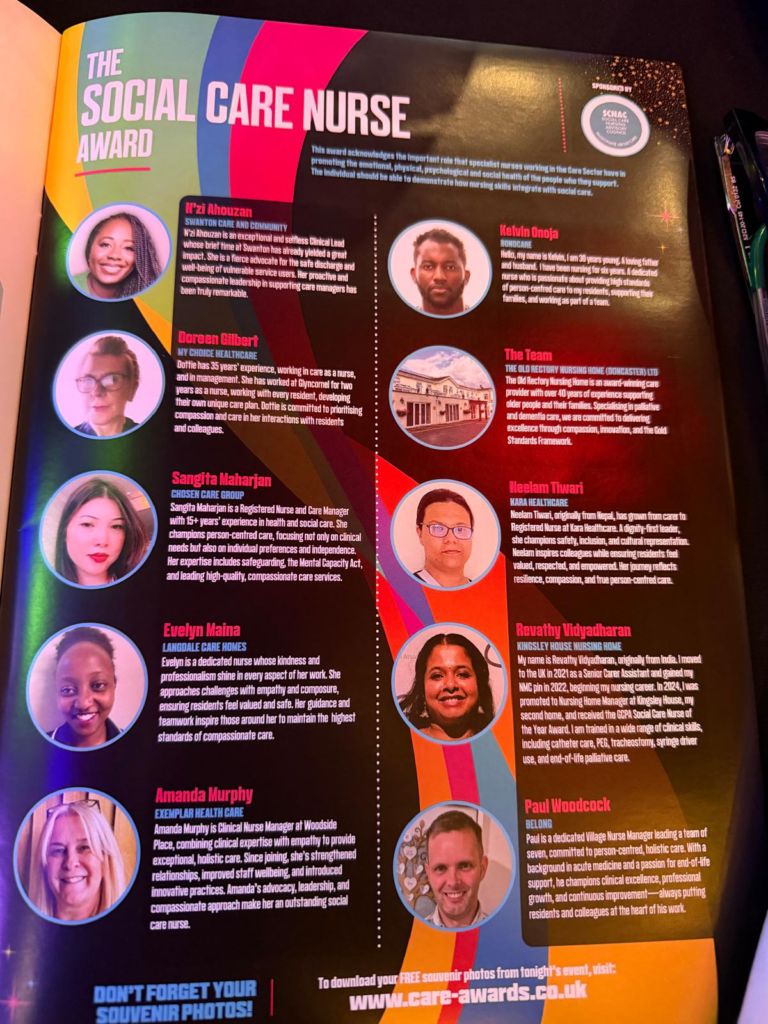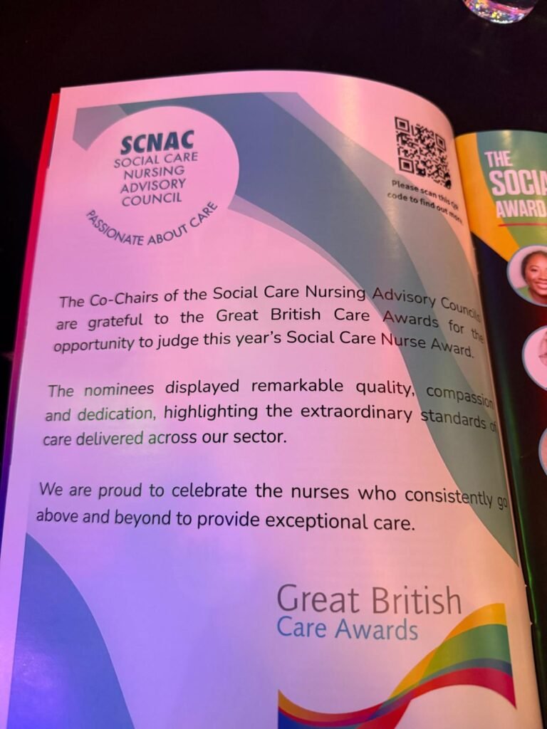 I had the true privilege of serving as a judge for the Adult Social Care Nursing Award, alongside fellow Co-Chairs, on behalf of the Social Care Nursing Advisory Councils (SCNACs), who were proud sponsors of this year’s award.